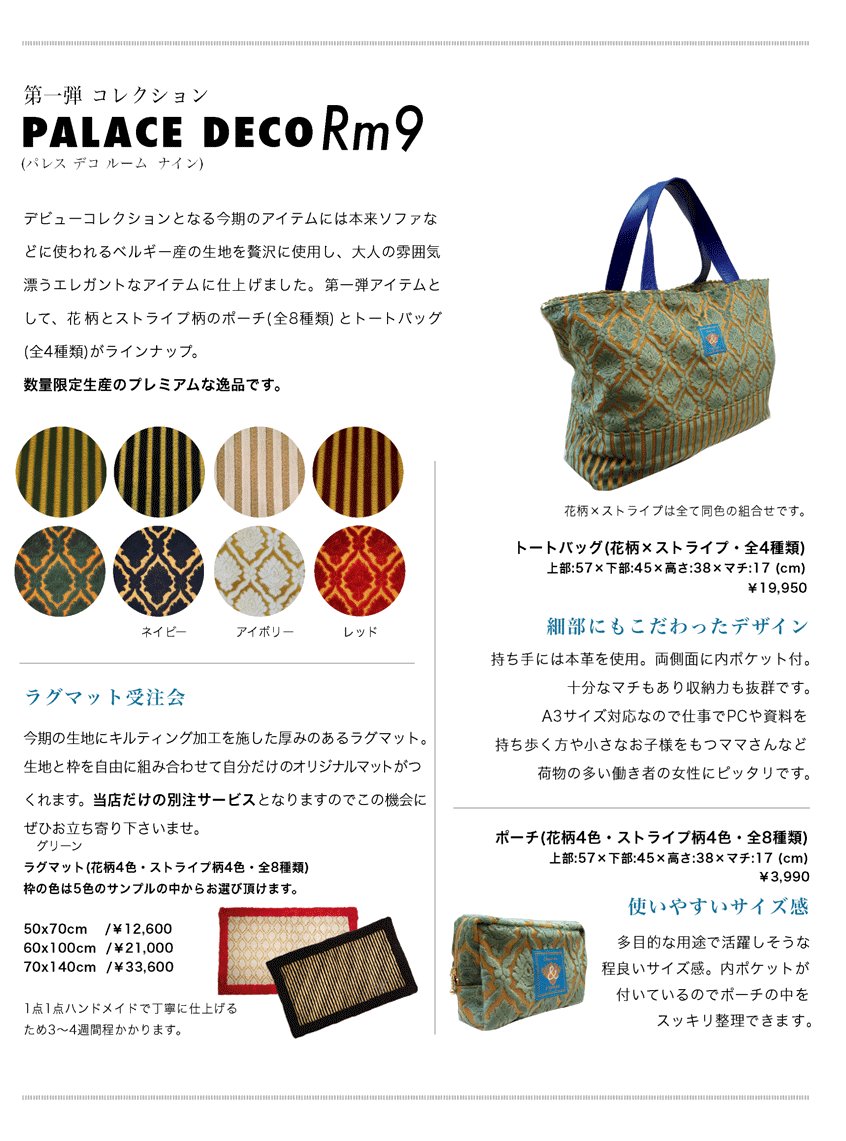 明るく前向きに生きる大人の女性をターゲットに、ソファー・オットマン、ラグマット、クッションカバー、ポーチ、ルームシューズなど、こだわりのライフスタイルグッズを幅広く展開。